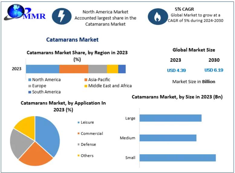 The Global Catamarans Market was valued at US$ 4.39 Billion in 2023 and is projected to grow at a CAGR of 5% from 2024 to 2030, reaching approximately US$ 6.19 Billion by 2030. Market growth is driven by increasing demand for luxury and leisure boating, technological advancements in catamaran design, and growing popularity of recreational and commercial maritime activities.Global Catamarans Market Overview