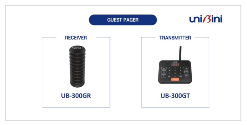 The UNIBELL queuing system is designed for businesses managing high guest volumes, offering fast, clear, and reliable customer calling operations. The system consists of the UB-400RM-3002 queuing monitor and the UB-300T transmitter, providing a seamless wireless calling solution.
