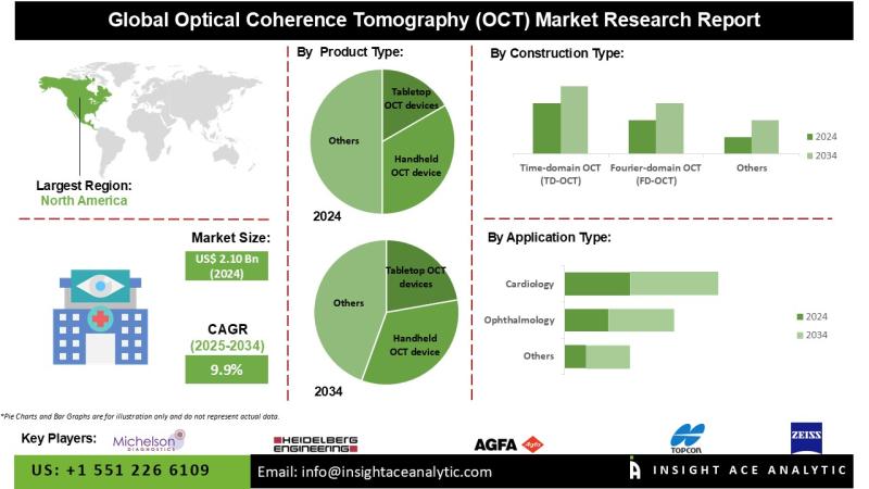 InsightAce Analytic Pvt. Ltd. announces the release of a market assessment report on the "Global Optical Coherence Tomography (OCT) Market- (By Construction Type (Time-domain OCT (TD-OCT), Spatial Encoded Frequency Domain OCT, Frequency Domain OCT (FD-OCT), Others), By Product Type (Catheter-based OCT Devices, Doppler OCT Devices, Tabletop OCT devices, Handheld OCT device), By Application Type (Ophthalmology, Cardiology, Gastroenterology, Urology, Dermatology, Dentistry, Others)), Trends, Industry Competition Analysis, Revenue and Forecast To 2034."According to the latest research by InsightAce Analytic, the Global Optical Coherence Tomography (OCT) Market Size is valued at USD 2.10 Bn in 2024 and is predicted to reach USD 5.37 Bn by the year 2034 at a 9.9% CAGR during the forecast period for 2025-2034.