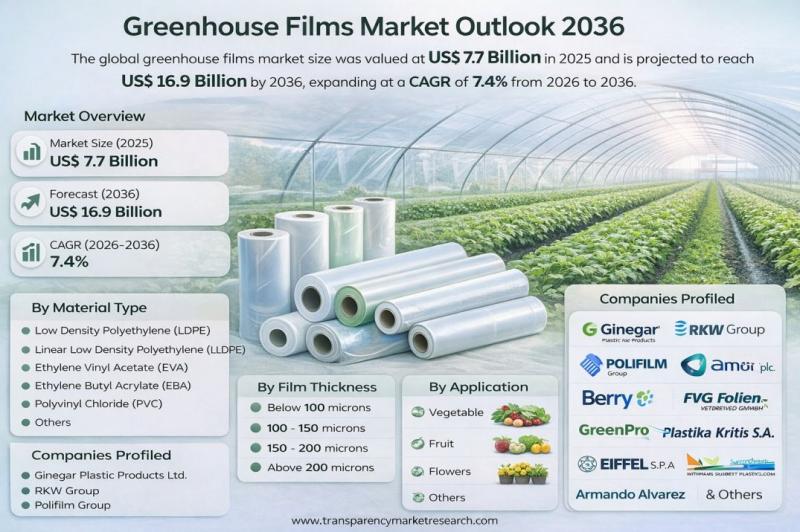 The global greenhouse films market was valued at US$ 7.7 Billion in 2025 and is projected to reach US$ 16.9 Billion by 2036, expanding at a compound annual growth rate (CAGR) of 7.4% from 2026 to 2036. This strong growth trajectory is supported by the rapid expansion of protected cultivation and polyhouse infrastructure worldwide, along with rising demand for high-yield, year-round crop production amid climate variability and food security concerns.