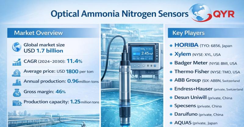 QY Research has released a comprehensive new market report on Optical Ammonia Nitrogen Sensors, advanced water-quality monitoring instruments that measure ammonia nitrogen (NH3-N / NH4+-N) concentrations using optical detection principles rather than electrochemical reactions. By leveraging spectrophotometry, fluorescence, or colorimetric optical methods, these sensors deliver high selectivity, low drift, and reduced maintenance-making them increasingly essential for wastewater treatment, surface water monitoring, aquaculture, and industrial process control. This report provides an in-depth assessment of global market size, sensing technologies, regulatory drivers, and competitive dynamics.Core Market Data