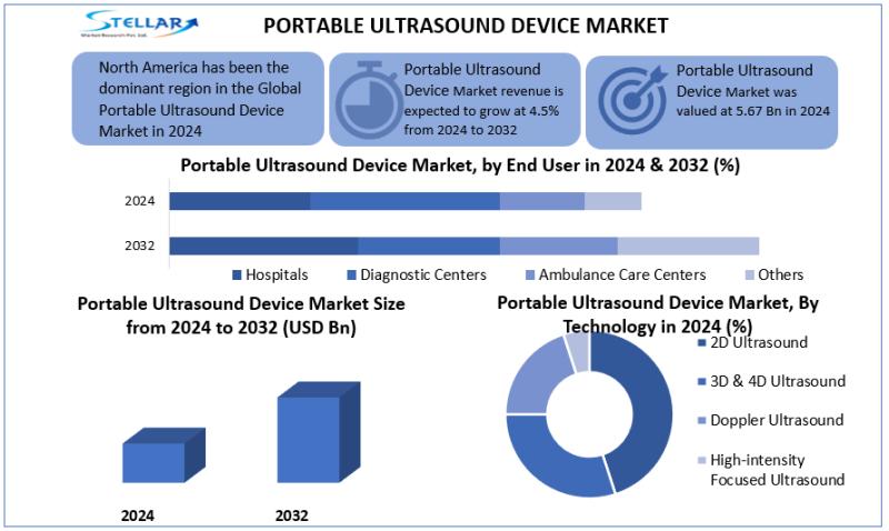 Portable Ultrasound Device Market was valued at USD 5.67 Bn in 2024 and is expected to reach USD 8.06 Bn by 2032, at a CAGR of 4.5% during the forecast period.