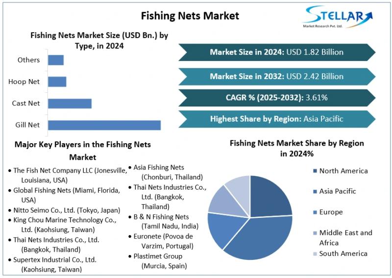 Fishing Nets Market size was valued at USD 1.82 Bn. in 2024 and is expected to reach USD 2.42 Bn. by 2032, at a CAGR of 3.61%.