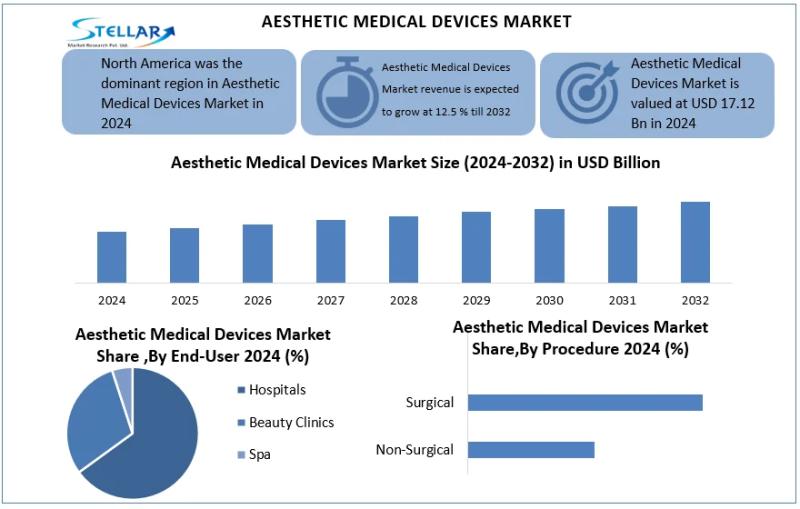 Aesthetic Medical Devices Market was USD 17.12 billion to reach USD 43.93 billion by 2032 at 12.5% CAGR, driven by non-invasive procedures, AI tech, and aging population demand.The aesthetic medical devices market has become a significant segment of the global healthcare and medical technology industry, driven by the rising demand for minimally invasive and noninvasive cosmetic procedures. Aesthetic medical devices are used to improve physical appearance by addressing concerns such as skin aging, wrinkles, unwanted hair, body contouring, pigmentation, and facial volume loss. These devices are widely used in dermatology clinics, cosmetic surgery centers, medical spas, and hospitals. Growing awareness of personal appearance, increasing disposable income, and technological advancements are shaping the steady expansion of this market across the world.