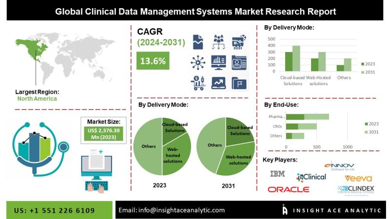 InsightAce Analytic Pvt. Ltd. announces the release of a market assessment report on the "Global Clinical Data Management Systems Market- by Delivery Mode (Licensed Enterprise Solutions, Cloud-based Solutions, and Web-hosted Solutions), End-Use (Contract Research Organizations, Medical Device Companies, and Pharma/Biotech Companies), Trends, Industry Competition Analysis, Revenue and Forecast To 2031." According to the latest research by InsightAce Analytic, the global Clinical Data Management Systems market is valued at USD 2,376.39 Million