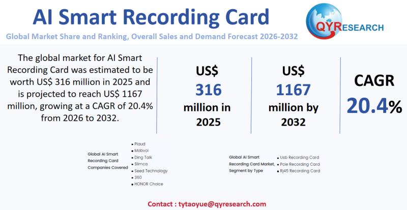 Unlock the Future of the AI Smart Recording Card Market: Comprehensive Global Market Report 2026-2032 Global leading market research publisher QYResearch published the release of its latest report, "AI Smart Recording Card - Global Market Share, Ranking, Sales, and Demand Forecast 2026-2032". This in-depth report provides a complete analysis of the global AI Smart Recording Card market, offering critical insights into market size, share, demand, industry development status, and future forecasts.