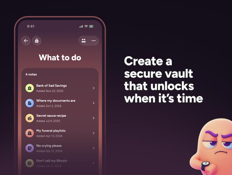 Users can store instructions, personal notes, photos, documents, playlists, and essential information into secure vaults, assign trusted people to one or all of them, and decide how access should be granted. If a report is triggered prematurely, the user has time to step in and stop it.