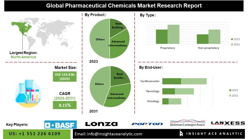 InsightAce Analytic Pvt. Ltd. announces the release of a market assessment report on the "Global pharmaceutical Fine Chemicals Market (By Product (Basic Building Blocks, Advanced intermediates, and Active ingredients), Type (Proprietary, Non-proprietary), Chemical (Small Molecules, Big Molecules), By Application (Cardiovascular, Neurology, Oncology, Infectious diseases, Metabolic system, Diabetes, Respiratory diseases, Gastrointestinal diseases, Musculoskeletal diseases, and Other) Trends, Industry Competition Analysis, Revenue and Forecast To 2031."