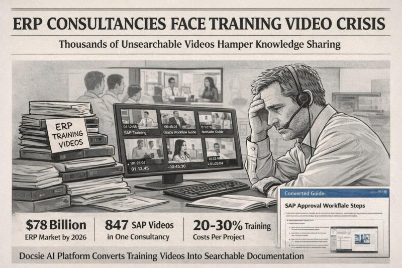 AUSTIN, TX - January 30, 2026 - Enterprise ERP consultancies managing SAP, Oracle, NetSuite, and Microsoft Dynamics implementations face a growing knowledge crisis: millions of dollars in training videos that cannot be searched, referenced, or reused across client engagements.