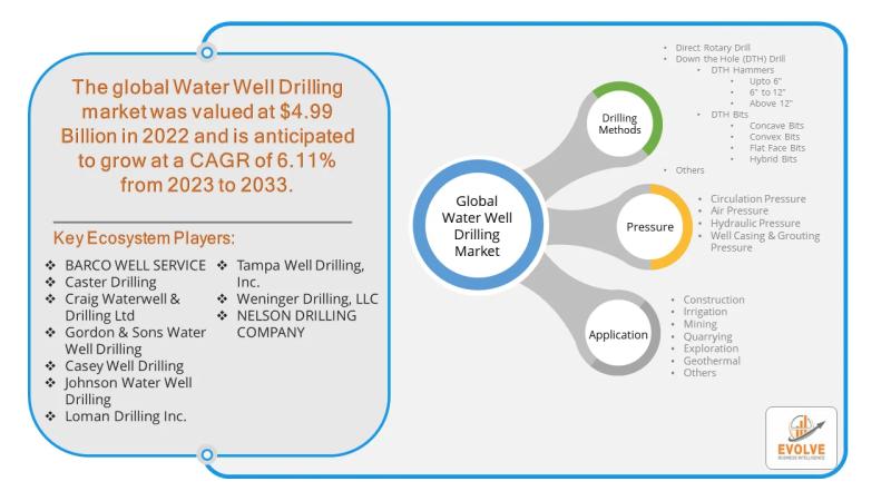 The global Water Well Drilling Market, valued at $4.99 Billion in 2022, is projected to grow at a CAGR of 6.11% from 2023 to 2033, reaching an estimated $21.92 billion by 2028. This growth is fueled by increasing demand for freshwater, population growth, and technological advancements. Among these advancements, the use of hydraulic pressure is emerging as a significant opportunity, offering efficiency and control in drilling operations.