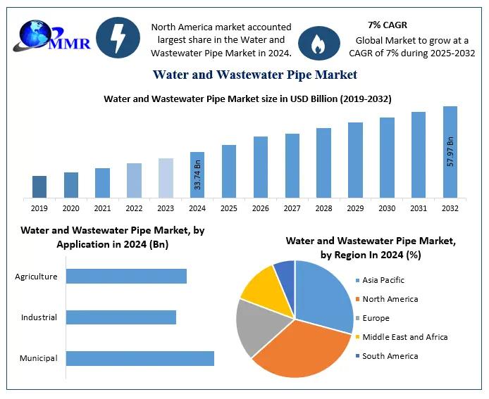 The Water and Wastewater Pipe Market was valued at USD 33.74 billion in 2024 and is projected to reach USD 57.97 billion by 2032, expanding at a compound annual growth rate (CAGR) of 7% from 2025 to 2032, according to the latest industry analysis.