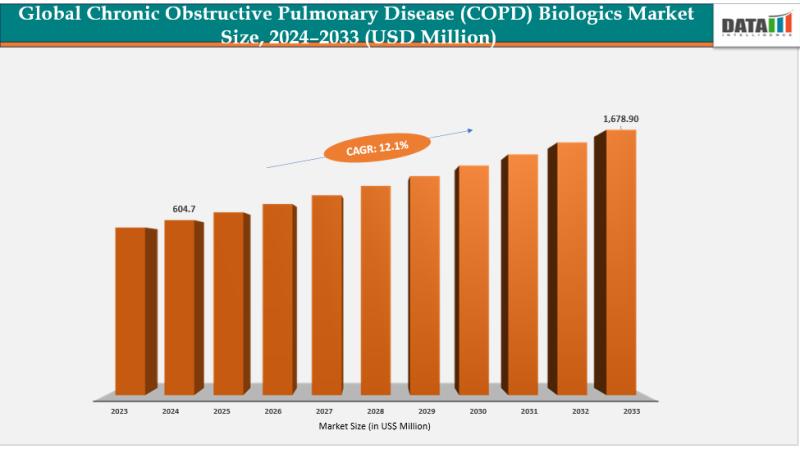 AUSTIN, Texas and TOKYO -- According to DataM Intelligence, The Chronic Obstructive Pulmonary Disease (COPD) Biologics Market Size reached US$ 604.70 million in 2024 and is projected to reach US$ 1,678.90 million by 2033, expanding at a CAGR of 12.1% during the forecast period 2025-2033. The COPD Biologics Market is transforming respiratory care by introducing monoclonal antibodies that target type 2 inflammation pathways, reducing exacerbations and hospitalizations in eosinophilic COPD.