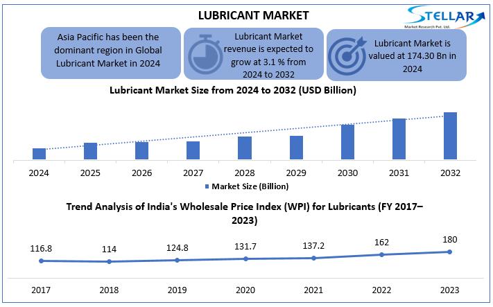 The Lubricants Market size was valued at USD 174.30 Billion in 2024 and the total Global Lubricants revenue is expected to grow at a CAGR of 3.1% from 2025 to 2032, reaching nearly USD 222.52 Billion by 2032.