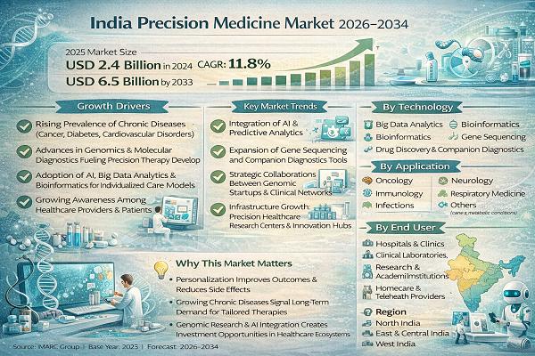 According to IMARC Group's report titled "India Precision Medicine Market Size, Share, Trends and Forecast by Product, Technology, Application, End User, and Region, 2026-2034" the report offers a comprehensive analysis of the industry, including market share, growth, trends, and regional insights.