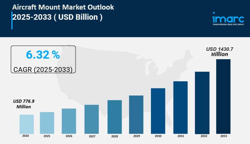 The global aircraft mounts market size reached USD 776.9 Million in 2024 and is projected to reach USD 1,430.7 Million by 2033, growing at a CAGR of 6.32% during 2025-2033. North America leads the market due to major aerospace hubs and a robust aviation industry. Growth is fueled by increasing air travel, defense spending, MRO activities, and the expansion of aerospace industry in emerging markets. The market sees demand from specialized aircraft configurations and ongoing technological advancements.