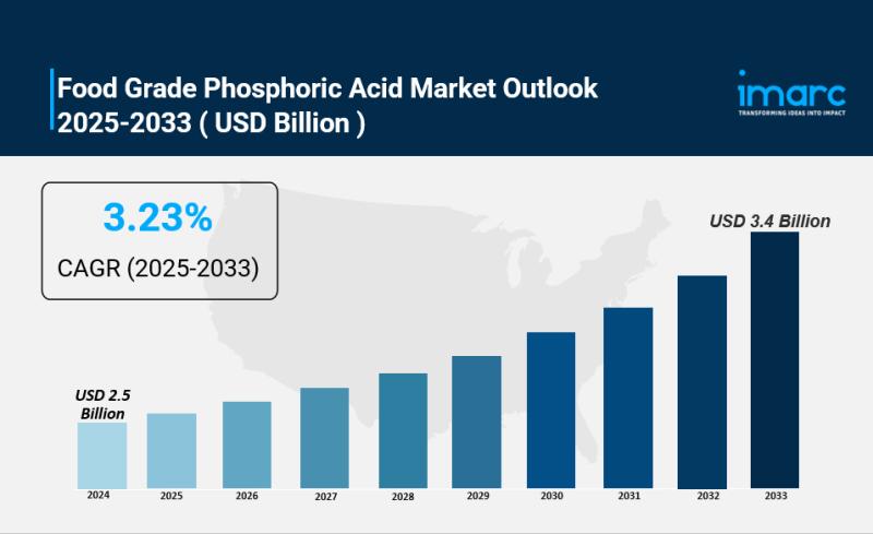 The global food grade phosphoric acid market was valued at USD 2.5 Billion in 2024 and is projected to reach USD 3.4 Billion by 2033, growing at a CAGR of 3.23% between 2025 and 2033. This growth is driven by increased consumer awareness of food safety, rising beverage consumption, and a growing demand for convenience foods due to changing individual tastes.