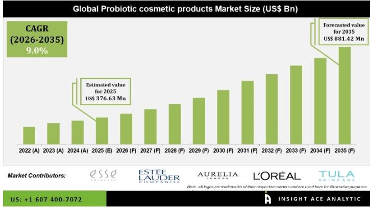 InsightAce Analytic Pvt. Ltd. announces the release of a market assessment report on the "Probiotic Cosmetic Products Market"-, By Products (Skin care, Hair care), By End-Users (Hypermarket & Supermarket, Pharmacy & Drug Store, E-commerce, Others) and Global Forecasts, 2026-2035 And Segment Revenue and Forecast To 2035." The Probiotic Cosmetic Products Market Size is valued at USD 376.63 Mn in 2025 and is predicted to reach USD 881.42 Mn