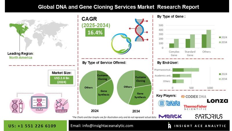 InsightAce Analytic Pvt. Ltd. has announced the publication of a market research report titled "Global DNA and Gene Cloning Services Market by Type of Service Offered (Custom Cloning, Sub-cloning, Gene Synthesis, and Others), Type of Gene (Complex Gene, Standard Gene, and Others), End-User Industry (Pharmaceutical, Academic and R&D, and Biotechnology Companies, and Others)- Market Outlook and Industry Analysis 2034" According to company's newest research, the Global DNA and Gene Cloning