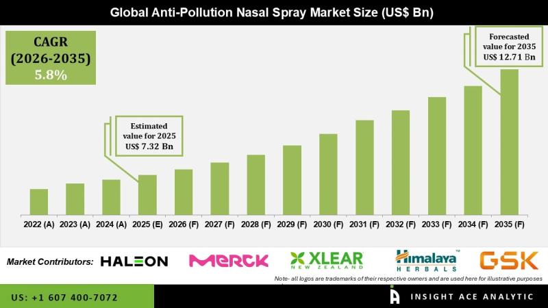 InsightAce Analytic Pvt. Ltd. announces the release of a market assessment report on the "Global Anti-Pollution Nasal Spray Market Size, Share & Trends Analysis Report By Product Type (Hydrating Nasal Sprays, Pollution Defense Products, Cleansing Nasal Sprays, Symptomatic Relief Nasal Sprays, and Others), Distribution Channel (Online Channels, Supermarkets/General Retail Stores, Retail Pharmacies, and Others),-Market Outlook And Industry Analysis 2035" Global Anti-Pollution Nasal Spray Market Size is valued at USD 7.32 Bn
