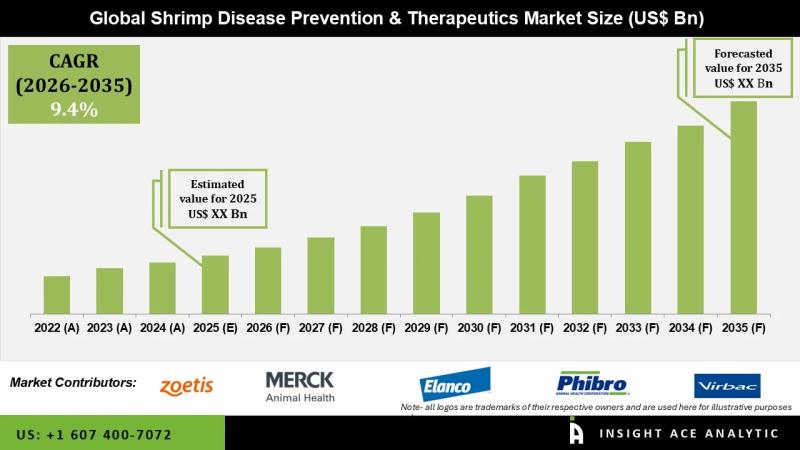 InsightAce Analytic Pvt. Ltd. announces the release of a market assessment report on the "Global Shrimp Disease Prevention & Therapeutics Market Size, Share & Trends Analysis Report By Shrimp Disease Prevention & Therapeutics Market Size, Share & Trends Analysis Distribution by Product Type (Disease Prevention (Probiotics & Microbial Products , Vaccines & Immunostimulants, Functional Health Feeds & Nutraceuticals, Biosecurity, Disinfectants & Diagnostics , Disease-Resistant Broodstock & Genetics), Therapeutics (Antibiotics, Antiparasitic & Antifungal Agents, Antivirals & Supportive Therapeutics, Chemical Disease-Control Treatments) By Disease Type (Viral Diseases, Bacterial Diseases, Parasitic & Microsporidian Diseases, Fungal & Opportunistic Pathogens), By End-user (Grow-Out Farms, Hatcheries & Nurseries, Integrated Farming & Feed Companies, Diagnostic Laboratories & Research Institute), Route of Administration (Oral, Water / Immersion / Bath Application, Injectable Delivery, Topical & External Application, Others),-Market Outlook And Industry Analysis 2035"Shrimp Disease Prevention and Therapeutics Market is estimated to grow at a 9.4% CAGR during the forecast period for 2026 to 2035.