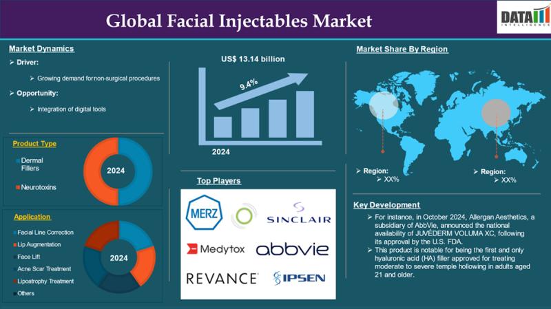The Global Facial Injectables Market reached US$ 13.14 billion in 2024 and is expected to reach US$ 27.64 billion by 2032, growing at a CAGR of 9.4 % during the forecast period 2025-2032, according to DataM Intelligence report.Facial injectables market growth is driven by rising aesthetic awareness, minimally invasive procedures, aging populations, quick recovery times, technological advances, and increasing acceptance of cosmetic treatments worldwide.