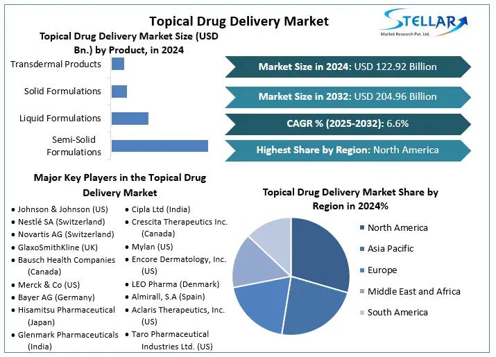 Topical Drug Delivery Market size was valued at USD 122.92 Bn. in 2024 and the total revenue is expected to grow at a CAGR of 6.6% through 2025 to 2032, reaching nearly USD 204.96 Bn The topical drug delivery market is becoming an increasingly important part of modern healthcare, offering effective ways to deliver medicines directly to the site of action through the skin, eyes, or mucous membranes. Unlike oral or