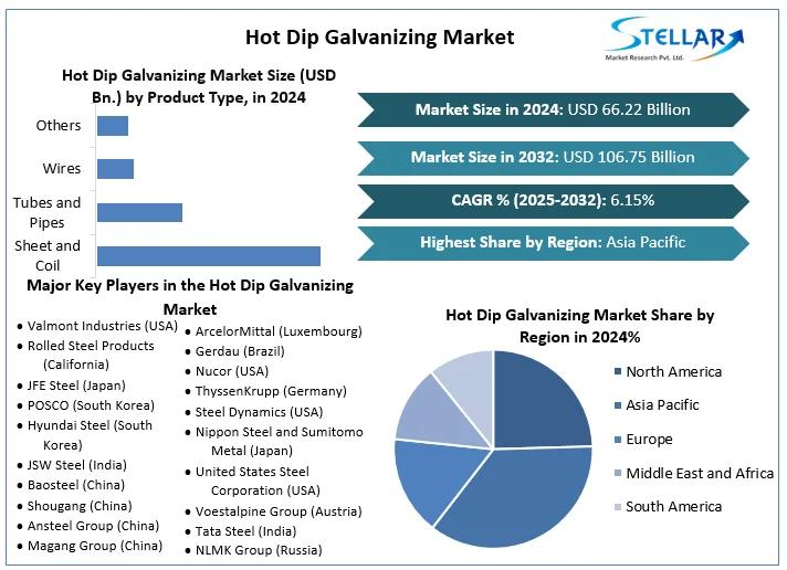 The Hot Dip Galvanizing Market size was valued at USD 66.22 Bn. in 2024 and the total Global Hot Dip Galvanizing revenue is expected to grow at a CAGR of 6.15 % from 2025 to 2032, reaching nearly USD 106.75 Bn. by 2032.