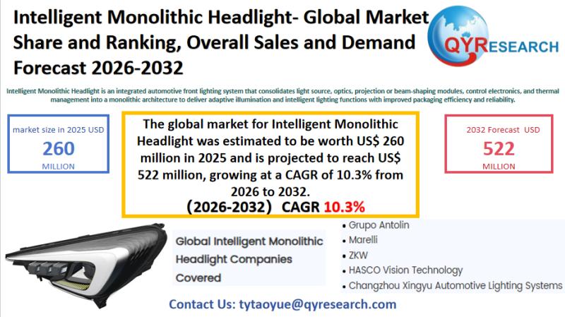 The global market for Intelligent Monolithic Headlight was estimated to be worth US$ 260 million in 2025 and is projected to reach US$ 522 million, growing at a CAGR of 10.3% from 2026 to 2032.Global Leading Market Research Publisher QYResearch announces the release of its latest report "Intelligent Monolithic Headlight - Global Market Share and Ranking, Overall Sales and Demand Forecast 2026-2032". Based on current situation and impact historical analysis (2021-2025) and forecast calculations (2026-2032), this report provides a comprehensive analysis of the global Intelligent Monolithic Headlight market, including market size, share, demand, industry development status, and forecasts for the next few years.