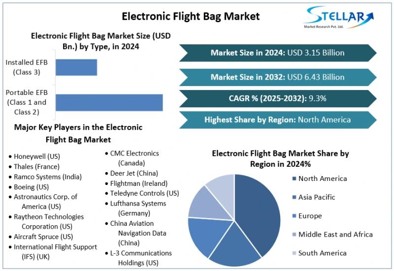 The Electronic Flight Bag Market size was valued at USD 3.15 Bn. in 2024 and the total Global Electronic Flight Bag revenue is expected to grow at a CAGR of 9.3% from 2025 to 2032, reaching nearly USD 6.43 Bn. by 2032.