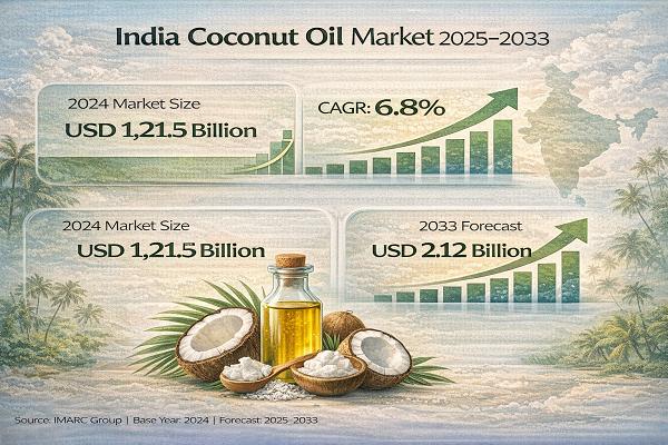 According to IMARC Group's report titled "India Coconut Oil Market Size, Share, Trends and Forecast by Source, Type, Application, Distribution Channel, and Region, 2025-2033" the report offers a comprehensive analysis of the industry, including market share, growth, trends, and regional insights.