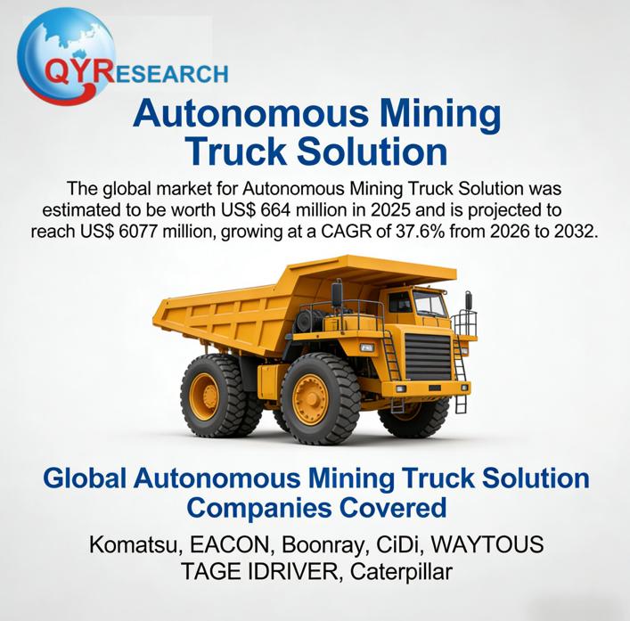 Unlock the Future of the Autonomous Mining Truck Solution Market: Comprehensive Global Market Report 2026-2032Global leading market research publisher QYResearch published the release of its latest report, "Autonomous Mining Truck Solution - Global Market Share, Ranking, Sales, and Demand Forecast 2026-2032". This in-depth report provides a complete analysis of the global Autonomous Mining Truck Solution market, offering critical insights into market size, share, demand, industry development status, and future forecasts. Whether you're a stakeholder, investor, or industry player, this report equips you with the data and strategies needed to stay ahead in a rapidly evolving market.