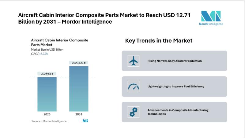 IntroductionThe Aircraft Cabin Interior Composite Parts Market is witnessing steady growth as aircraft OEMs and airlines increasingly focus on lightweight structures, fuel efficiency, and enhanced passenger comfort. According to Mordor Intelligence, the market is valued at USD 9.62 billion in 2026 and is expected to reach USD 12.71 billion by 2031, growing at a CAGR of 5.73% during the forecast period. Growth is driven by rising narrow-body aircraft production, increasing use of advanced composite materials, and expanding retrofit activity across global fleets.