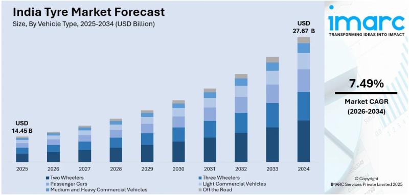 The latest report by IMARC Group, 'India Tyre Market Size, Share, Trends and Forecast by Vehicle Type, OEM and Replacement Segment, Domestic Production and Imports, Radial and Bias Tyres, Tube and Tubeless Tyres, Tyre Size, Price Segment, and Region, 2026-2034', provides a comprehensive industry analysis. It delivers deep insights into the Indian tyre ecosystem, highlighting growth drivers, competitive landscapes, and emerging segment trends for the 2026-2034 forecast period.