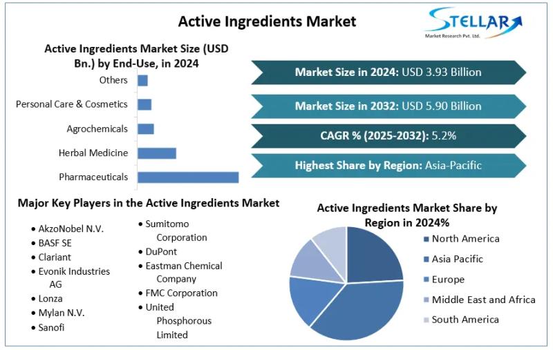 Active Ingredients Market size was valued at USD 3.93 Billion in 2024 and the Active Ingredients Market revenue is expected to grow at 5.2% through 2025 to 2032, reaching nearly USD 5.90 Billion.