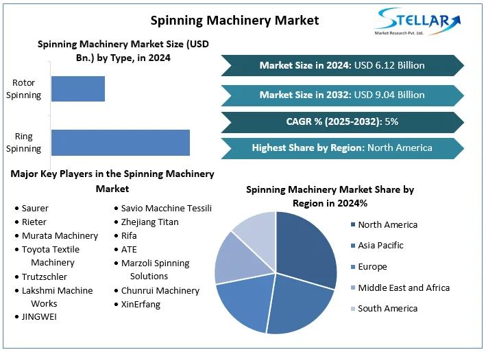 Spinning Machinery Market was valued at nearly USD 6.12 Bn. in 2024 and market size is estimated to grow at a CAGR of 5% and is expected to reach USD 9.04 Bn. by 2032.