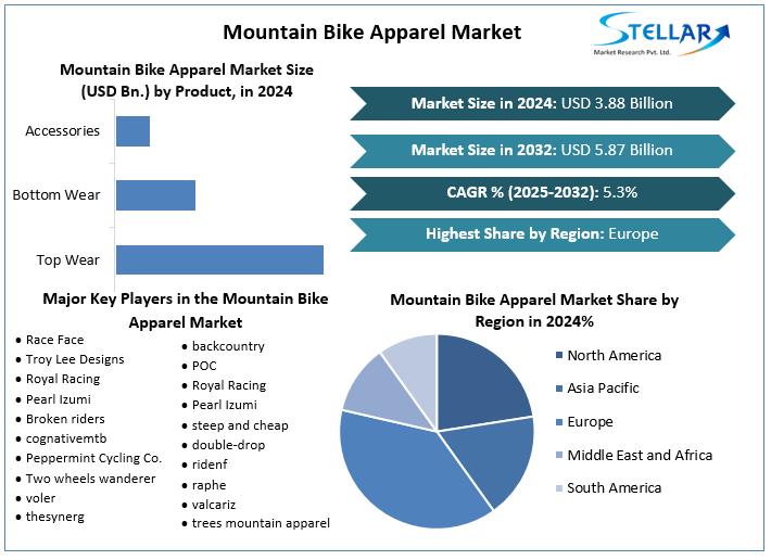The Mountain bike apparel Market size was valued at USD 3.88 Bn. in 2024 and the total Global Mountain bike apparel revenue is expected to grow at a CAGR of 5.3% from 2025 to 2032, reaching nearly USD 5.87 Bn. by 2032.