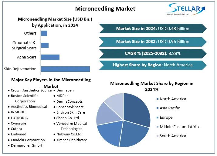 The Microneedling Market size was valued at USD 0.48 Bn. in 2024 and the Microneedling revenue is expected to grow at a CAGR of 8.88% from 2025 to 2032, reaching nearly USD 0.96 Bn. by 2032.
