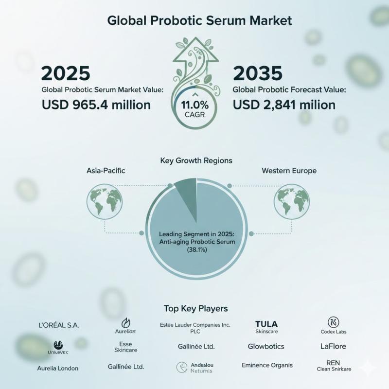 The global probiotic serum market is entering a decade of accelerated growth as skincare companies, dermatologists, and consumers converge around microbiome-focused solutions. According to newly consolidated industry data, the market is projected to grow from USD 965.4 million in 2025 to USD 2,841 million by 2035, representing an absolute increase of USD 1,875.6 million, a 194.2% expansion, and a compound annual growth rate (CAGR) of 11.0% over the forecast period.This growth reflects a structural shift in the global skincare industry toward functional, science-backed serums designed to support skin barrier health, inflammation control, and age-related concerns.
