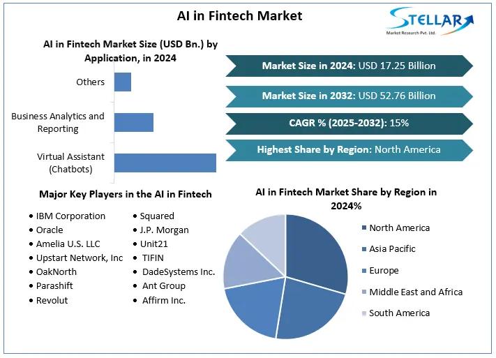 AI in Fintech Market size was valued at USD 17.25 Billion. in 2024 and the total Global AI in Fintech Market revenue is expected to grow at a CAGR of 15% from 2025 to 2032, reaching nearly USD 52.76 Billion.