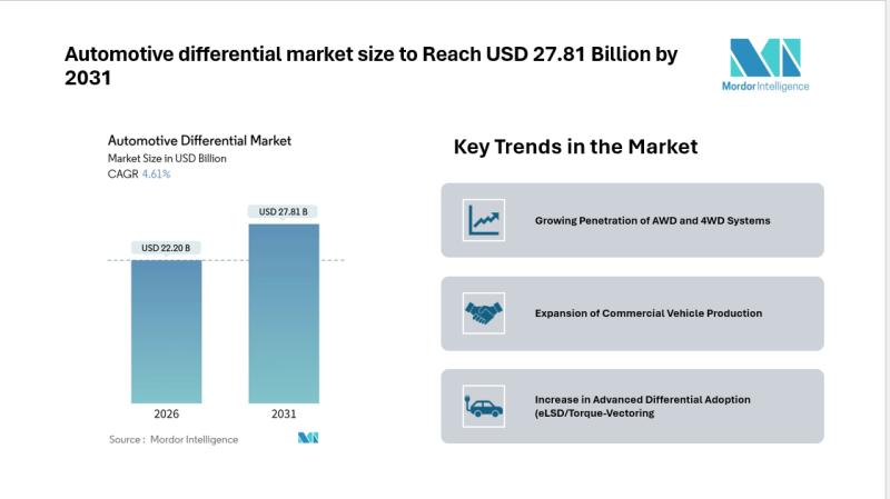 According to Mordor Intelligence, the automotive differential market size reached USD 22.20 billion in 2026 and is projected to reach USD 27.81 billion by 2031, reflecting consistent demand across passenger and commercial vehicle segments during the forecast period.