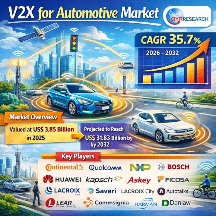 QY Research Inc., A global market research and consulting firm, has announced the release of its latest 2026 report titled "V2X for Automotive - Global Market Share and Ranking, Overall Sales and Demand Forecast 2026-2032." The report provides a data-driven analysis of the global V2X for Automotive market, integrating historical insights from 2020-2025 with forward-looking forecasts through 2032. It covers market size, competitive landscape, demand…