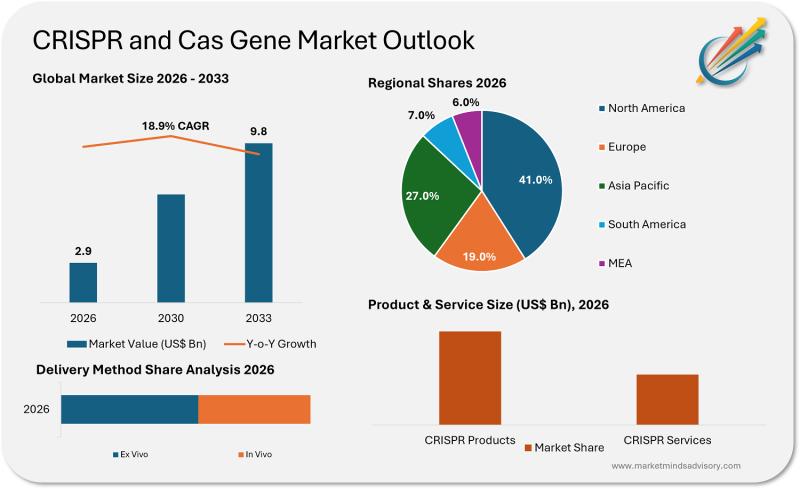 The CRISPR and Cas gene market is positioned at the forefront of genomic innovation, with a projected value of USD 2.9 billion in 2026 and an anticipated expansion to USD 9.8 billion by 2033. This robust growth trajectory, underpinned by an 18.9% CAGR, reflects accelerating adoption of CRISPR-based technologies across therapeutic development, agricultural biotechnology, and functional genomics. The market's evolution is characterized by increasing…