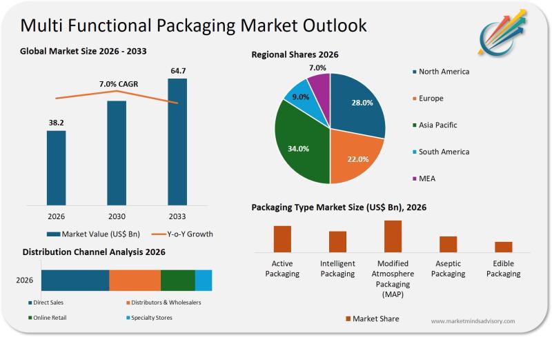 The Multi Functional Packaging Market is entering a phase of accelerated expansion, with a projected value of USD 64.7 billion by 2033, up from USD 38.2 billion in 2026, according to Market Minds Advisory. This market's current positioning is defined by the convergence of advanced materials, intelligent packaging systems, and heightened consumer expectations for product safety, convenience, and sustainability. The sector is witnessing robust investment from food and beverage, pharmaceuticals,…