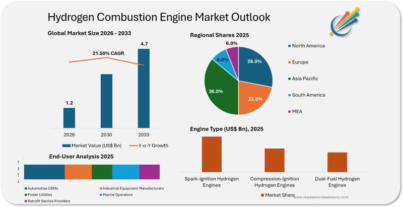 The hydrogen combustion engine market is emerging as a critical segment within the global transition to low-carbon mobility solutions. In 2026, the market is projected to reach USD 1.2 billion, reflecting early-stage adoption and focused R&D investments. By 2033, the market is forecast to expand to USD 4.7 billion, propelled by a compound annual growth rate of 21.5%, according to Market Minds Advisory. This rapid expansion…