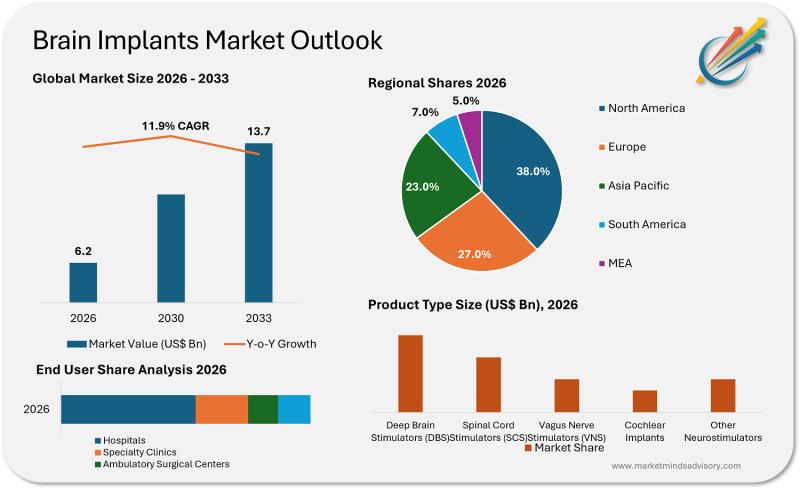 The brain implants market is currently positioned as a critical enabler of advanced neurological care, with applications spanning from movement disorder management to emerging cognitive enhancement therapies. In 2026, the market is valued at USD 6.2 billion, reflecting robust demand for deep brain stimulation, cochlear, and vagus nerve implants. This sector is witnessing rapid technological evolution, underpinned by advances in miniaturization, wireless communication, and biocompatible materials.