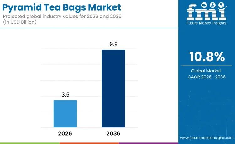 The global Pyramid Tea Bags Market is poised for sustained expansion over the next decade, reflecting structural changes in tea consumption, packaging innovation, and premium beverage demand. According to the latest industry outlook, the market is projected to be valued at USD 3.5 billion in 2026 and is expected to reach USD 9.9 billion by 2036, expanding at a compound annual growth rate (CAGR) of 10.8% during the forecast period.