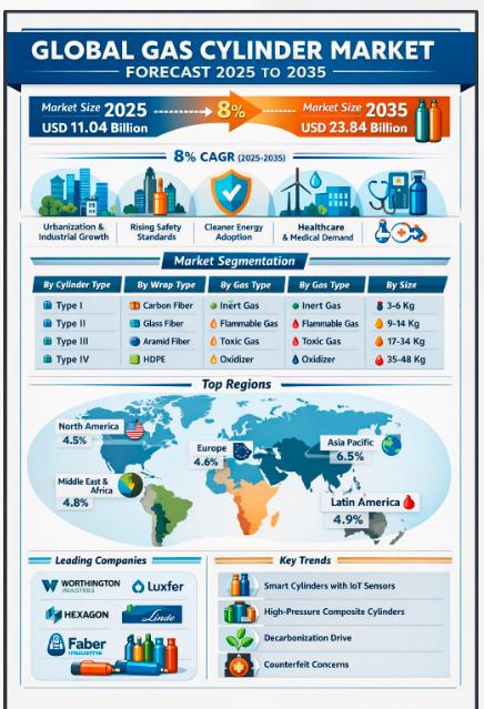 The global gas cylinder industry is undergoing a high-tech metamorphosis. Once seen as a stagnant commodity market, the sector is now a cornerstone of the global energy transition. According to the latest comprehensive analysis by Fact.MR, the global gas cylinder market is valued at USD 11.04 billion in 2025 and is on track to reach a staggering USD 23.84 billion by 2035.