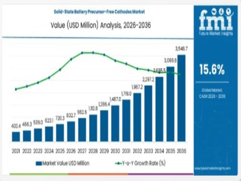 The global Solid-State Battery Precursor-Free Cathodes Market is on track for explosive expansion, projected to grow from USD 832.7 million in 2026 to USD 3,548.7 million by 2036, reflecting a robust 15.6 % compound annual growth rate (CAGR) over the forecast period. This data-driven outlook underscores the technology's rapidly increasing role as a cornerstone of next-generation energy storage solutions, particularly in electric vehicles (EVs) and renewable energy systems where safety, performance, and sustainability are paramount.Key Market Insights at a Glance reveal that precursor-free cathodes-critical components that eliminate conventional precursor synthesis steps-are accelerating solid-state battery adoption by reducing manufacturing complexity and enhancing performance reliability. The rising shift from liquid electrolyte lithium-ion batteries to solid electrolytes that harness these advanced cathodes is a primary catalyst for market expansion. Premium performance attributes such as higher energy density, improved safety profiles, and long-term cycle stability are influencing OEM and integrator investment decisions globally.