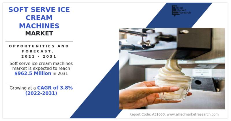 Soft serve ice cream machines market size was valued at $665 million in 2021, and is projected to reach $962.5 million by 2031, growing at a CAGR of 3.8% from 2022 to 2031.