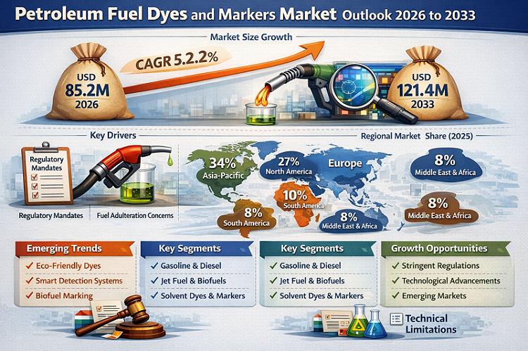 The Petroleum Fuel Dyes and Markers Market is projected to expand from USD 85.2 billion in 2026 to USD 121.4 billion by 2033, registering a CAGR of 5.2%, according to Market Minds Advisory. The market occupies a critical role within the downstream petroleum value chain, enabling product differentiation, regulatory compliance, and fraud prevention. Fuel dyes and chemical markers are embedded across gasoline, diesel, aviation fuel, and specialty fuel streams to…